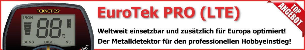Teknetics Eurotek PRO (LTE) Metalldetektor - neueste Version Absolut empfehlenswerter moderner Metalldetektor mit Leitwert- und Tiefenanzeige im Display. Ideal für die Suche nach Münzen, Schmuck und Militaria. |